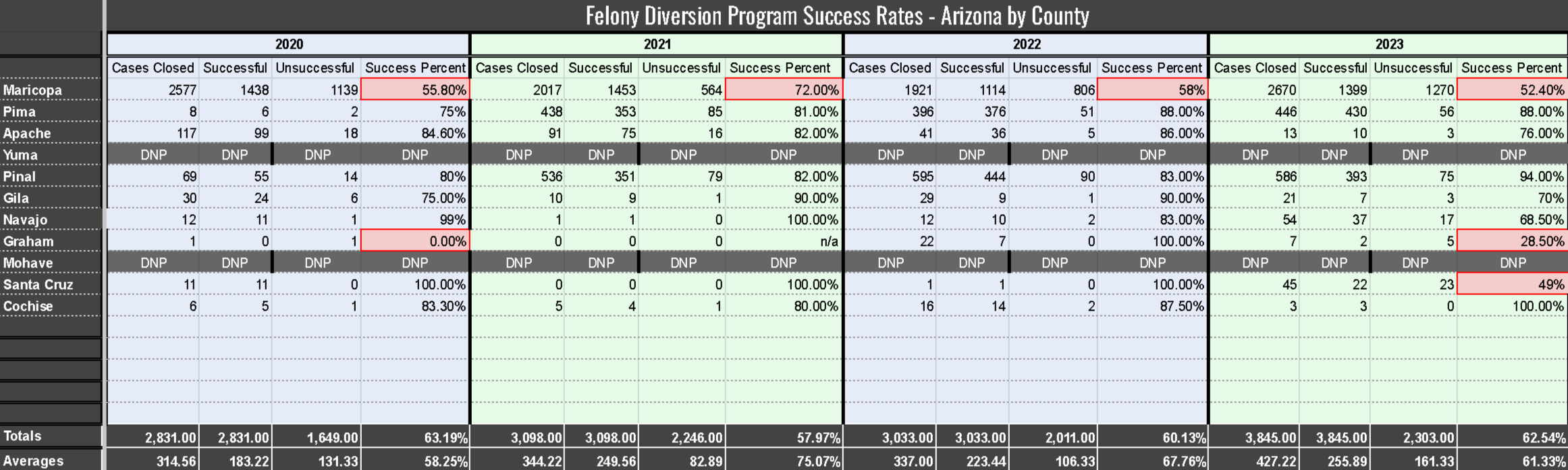 Image showing success rate of diversion program by county; Maricopa county is consistenty the lowest by a substantial margin. (Click image to view full size)
